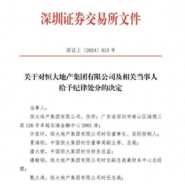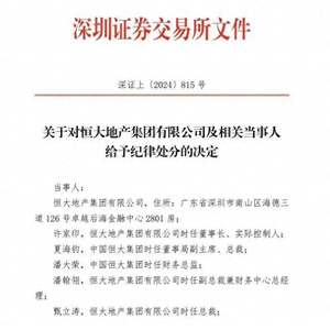 9月30日,深交所发布对恒大地产集团及相关当事人给予纪律处分的决定。大概的意思是三年内不接受恒大地产集团的债券发行申请或者是挂牌转让,许家印和夏海钧不得担任债券发行人董事、监事、高级管理人员。原首席财务官潘大荣、原财务中心总经理潘翰翎十年内不得担任这些职务。另外,对恒大地产集团,许家印,夏海钧和潘大荣等6位原来的高管公开谴责。