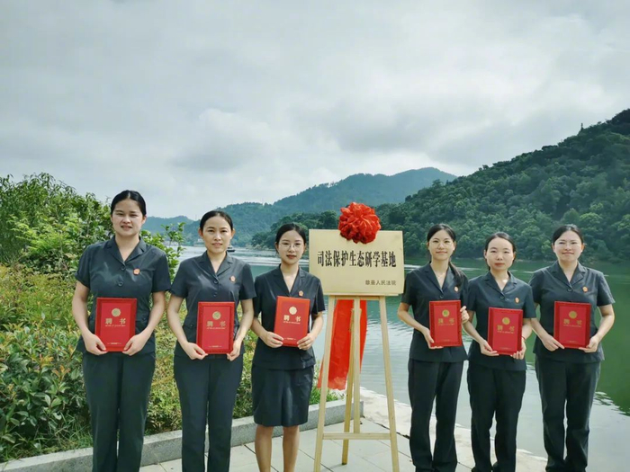 我们的“小家”有干警7人,保安大哥1人。我们是守护一江碧水的“生态法庭”。这里设立了全省首个“司法保护新安江工作站”,创新“江中水、水下鱼、岸边山、山里树、树上果”立体保护新模式,组建生态保护专员,集中审理涉新安江环境资源案件。