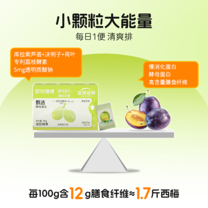 其内含12%的膳食纤维,不仅低热量、高饱腹,还能有效促进肠道蠕动,为肠道增添动力。每粒软糖含10毫克92.5%高吸收酵母蛋白,采用专利酶解技术,实现营养高吸收与慢消化,持续调理肠道健康。四重植物精萃,包括专利荔枝酵素与1600倍SOD,这些成分能缓解便秘有积极作用。。此外,还特别添加了5毫克透明质酸钠,进一步促进肠道的顺畅蠕动。