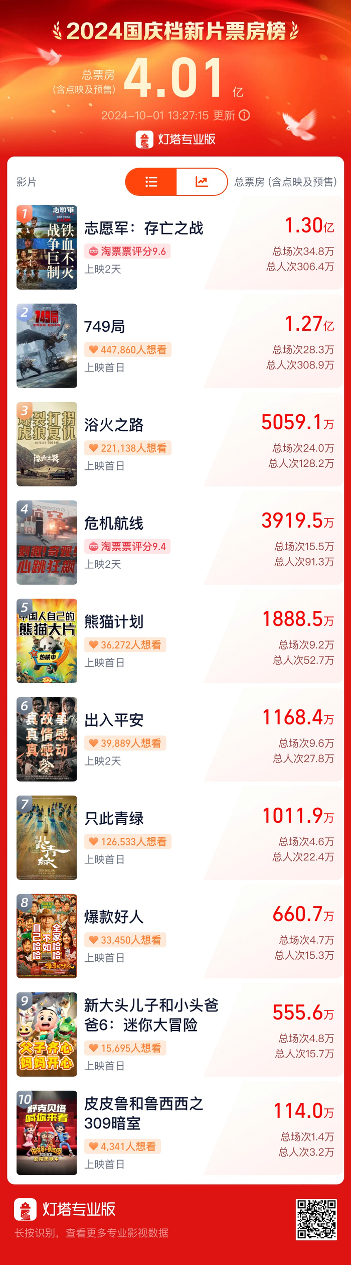 据灯塔专业版,截至记者发稿时,2024年国庆档新片总票房(含预售及点映)已突破4亿元。其中票房前三位分别为《志愿军:存亡之战》《749局》《浴火之路》。