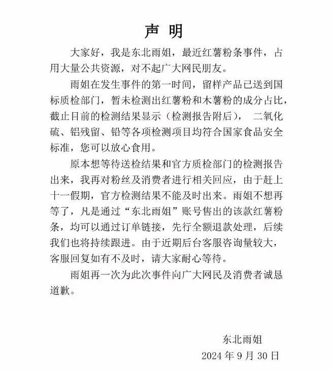 “原本想等待送检结果和官方质检部门的检测报告出来,我再对粉丝及消费者进行相关回应,由于赶上十一假期,官方检测结果不能及时出来。”“东北雨姐”表示,不想再等,凡是通过“东北雨姐”账号售出的该款红薯粉条,均可以通过订单链接,先行全额退款处理,后续也将持续跟进。“由于近期后台客服咨询量较大,客服回复如有不及时,请大家耐心等待。雨姐再一次为此次事件向广大网民及消费者诚恳道歉。”