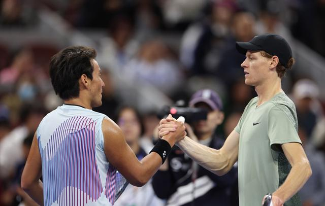 10月1日,布云朝克特(左)在赛后与辛纳握手致意。 当日,在北京进行的2024中国网球公开赛男单半决赛中,中国选手布云朝克特0比2不敌意大利选手辛纳,无缘决赛。 新华社发(杜昕怡摄)