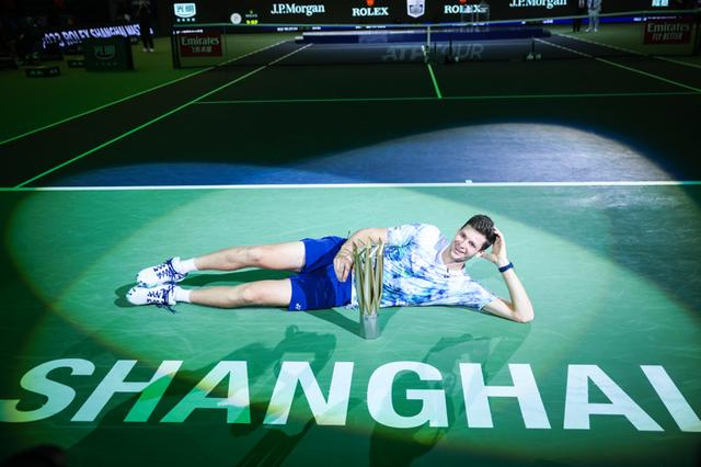 2023年10月15日,ATP上海网球大师赛单打决赛,俄罗斯选手卢布列夫对阵波兰选手胡尔卡奇,最终胡尔卡奇夺得冠军。 这是胡尔卡奇在颁奖仪式上庆祝。