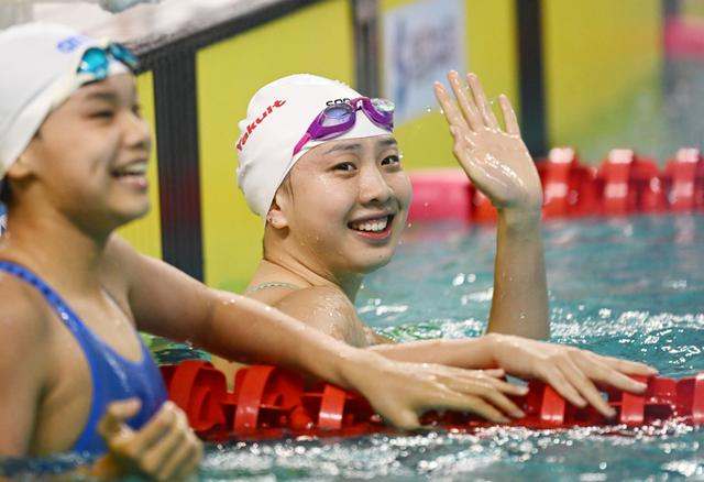 9月29日,唐钱婷(右)在比赛后向观众挥手致意。 当日,在湖北武汉举行的2024年全国游泳锦标赛(25米)女子50米蛙泳决赛中,上海安踏队选手唐钱婷以28秒82的成绩获得冠军。 新华社记者 程敏 摄