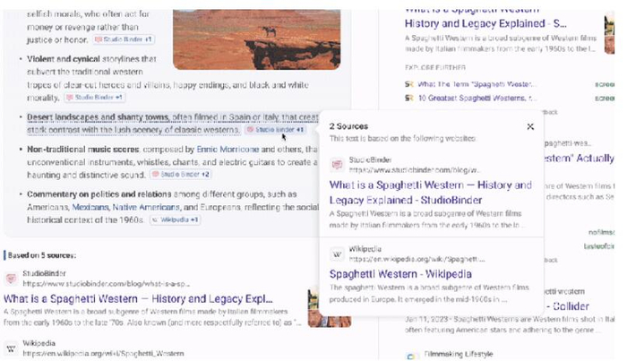 必应生成式搜索给予多种AI模型汇总来自互联网的信息,生成响应搜索查询的摘要内容。比如当用户搜索查看“什么是意大利式西部片?”这个问题时,必应生成式搜索将显示该类型片的历史和示例的摘要,以及来源链接。