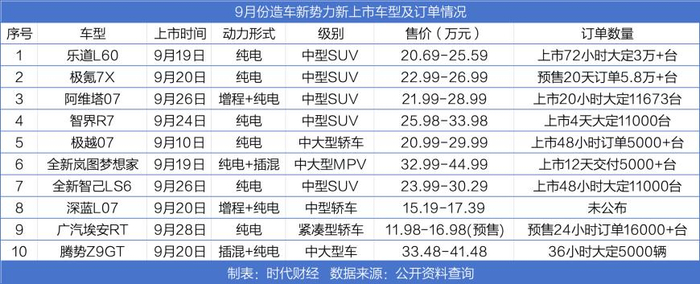 据时代财经不完全统计,自9月15日以来,已有超过40款全新车型或改款车型投向市场。其中仅新势力阵营,9月份就发布了10余款新车型,提前迎接竞争更为激烈的四季度。
