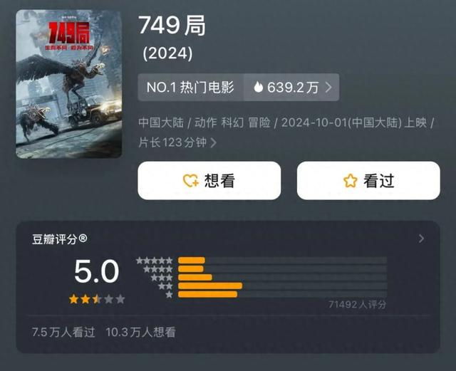豆瓣评分显示,截至10月2日上午11时,电影《749局》得分5.0分,共有超7万名网友打分,其中有30.7%的网友给出了2星评价,28.2%的网友给出了1星评价。