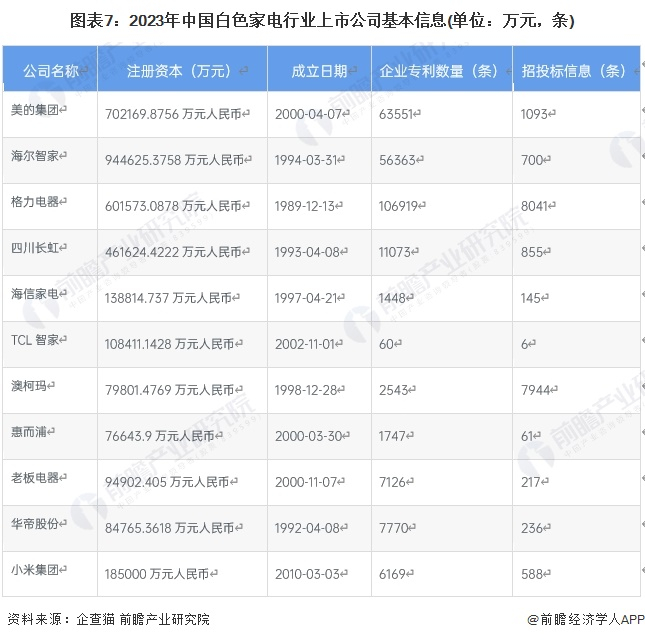 从白色家电行业的上市企业布局和已有公开信息分析,注册资本最多的是海尔智家,格力电器招投标信息与专利信息最多,同时成立时间最早。