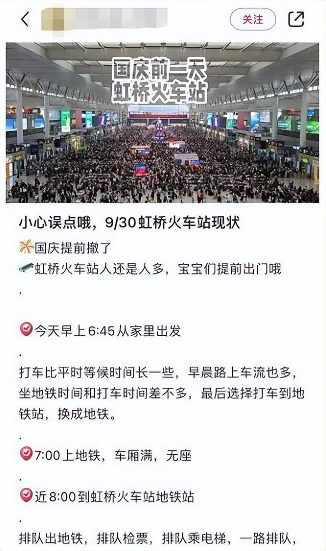 铁路航空也迎来客流高峰。9月30日,铁路上海站迎来客流高峰,比日常客流多20余万人次。上海虹桥站人山人海,有网友感叹:出地铁排队、乘电梯排队、检票排队……差点没赶上车。
