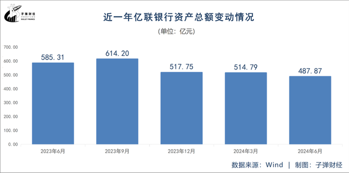 截至2024年6月末,亿联银行资产总额为487.87亿元,较年初减少29.88亿元。在2024年一季度末,亿联银行资产总额为514.79亿元,这就意味着,仅二季度亿联银行资产总额下降26.92亿元。