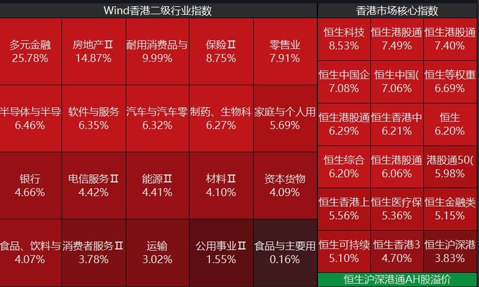 Wind数据显示,当日香港二级行业指数多个板块实现大幅增长,其中多元金融增长迅猛,涨幅达25.78%,另外,房地产、保险、耐用消费品与服装、零售业、软件与服务汽车与汽车零部件、半导体与半导体生产设备等板块涨幅均超过了6个百分点。
