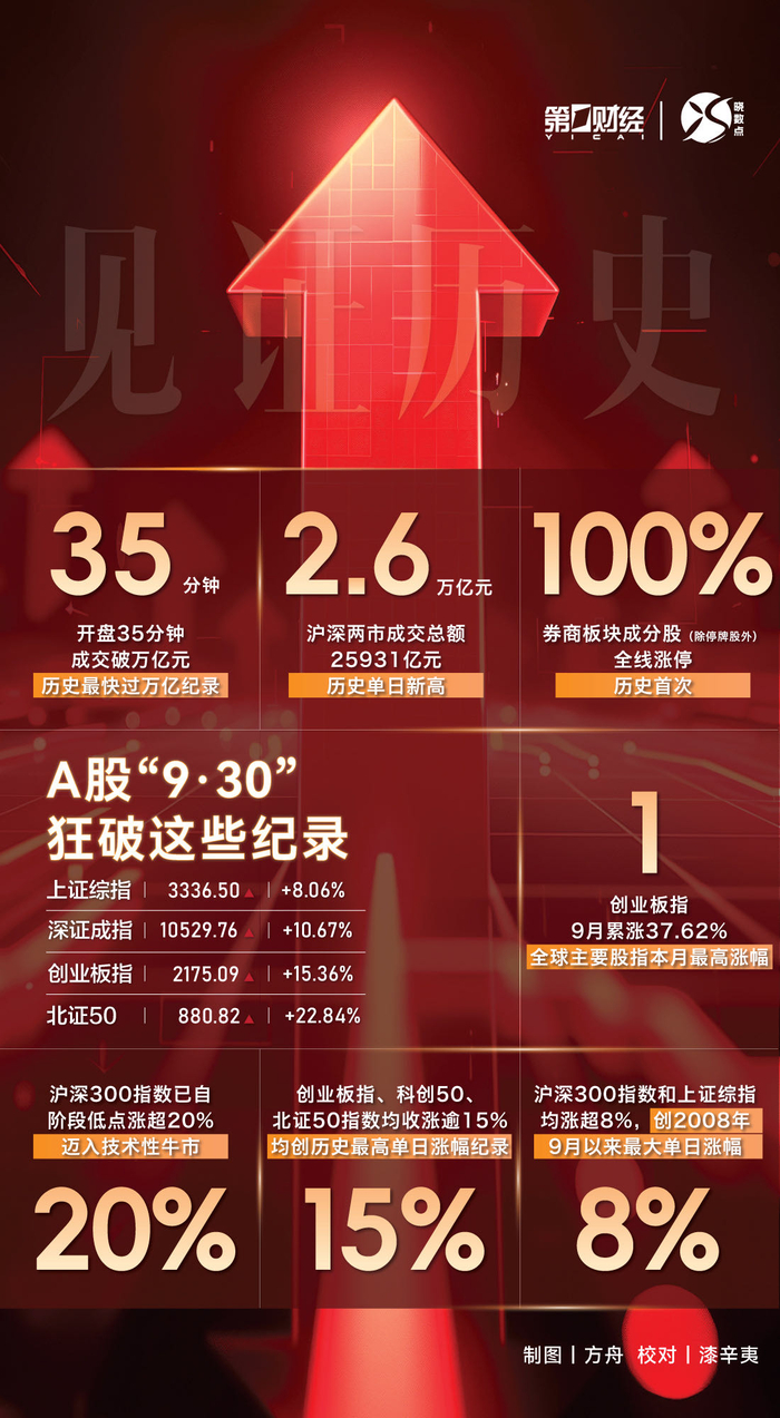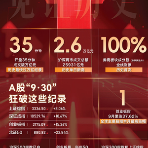 大张和股友们总结下来,9月30日的A股,诞生了六项新纪录。指数方面:创业板指单日涨幅最高纪录(15.36%),5日上涨42.12%;科创50指数单日涨幅最高纪录(17.88%),5日上涨35.66%;北证50指数单日涨幅最高纪录(22.84%),5日上涨46.86%;深成指单日涨幅创实行涨跌幅限制以来最高纪录(10.67%),5日上涨30.26%。