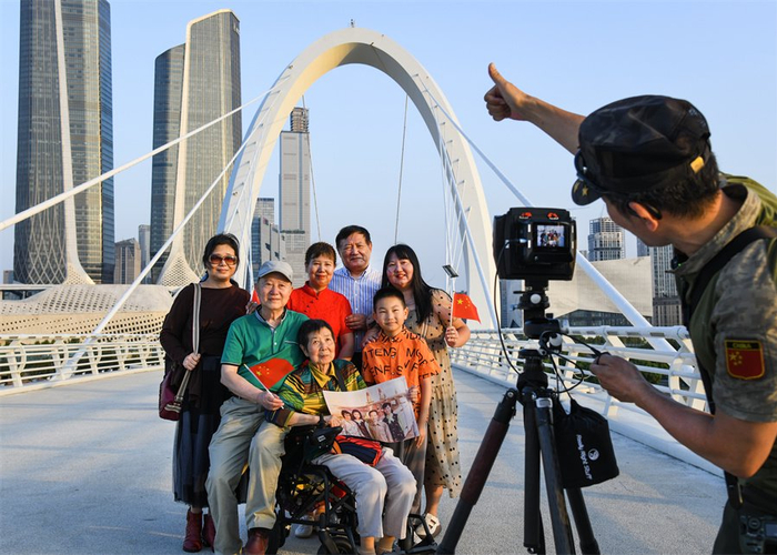 在新中国75周年华诞到来之际,家住南京秦淮区的施顺才老人翻看着不同年代的国庆留影,禁不住感慨万千。9月28日,施顺才举家来到长江上首座观光步行桥、“南京眼”步行桥游览,定格下四世同堂、家国同庆的幸福瞬间。这些跨越75年的国庆留影,成为见证“小家”与“大国”共同成长的珍贵记忆。
