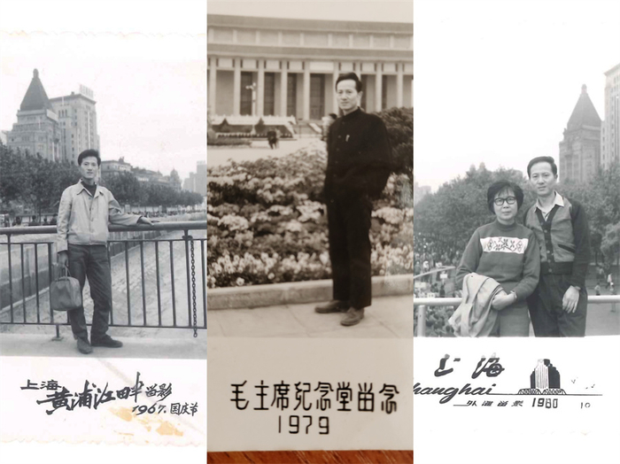 从左向右依次是:1967年国庆,在上海黄浦江畔留影;1979年国庆,在天安门广场留影;1980年国庆,在上海外滩留影。