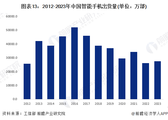 2012-2023年中国智能手机出货量整体呈波动下降的趋势,2021-2022年开始智能手机出货量连续两年出现下降,2023年出货量回升至2.76亿部,同比增长4.5%,但仍处于低位。