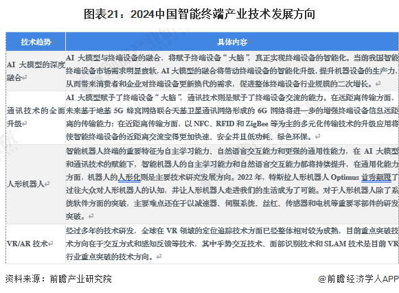 智能终端的技术创新首先将是AI大模型的应用和通讯技术的全面升级,这两大技术在智能终端的应用,将真正提升终端产品的思考决策能力和沟通交流能力。其次是主流技术领域方向——人形机器人和VR技术,在不远的将来,全球智能终端产品将迎来颠覆性的产品创新,行业具体技术趋势方向如下: