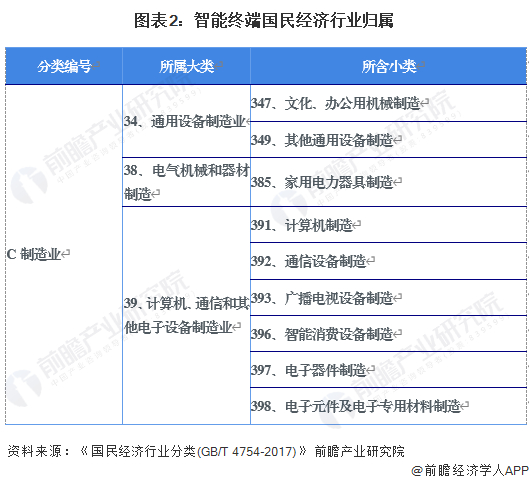 当前在《国民经济行业分类》并没有直接针对智能终端的定义分类,因此根据智能终端概念和分类,结合《国民经济行业分类》(GB/T4754-2017),智能终端制造行业涉及制造业中的3个大类和多个小类。