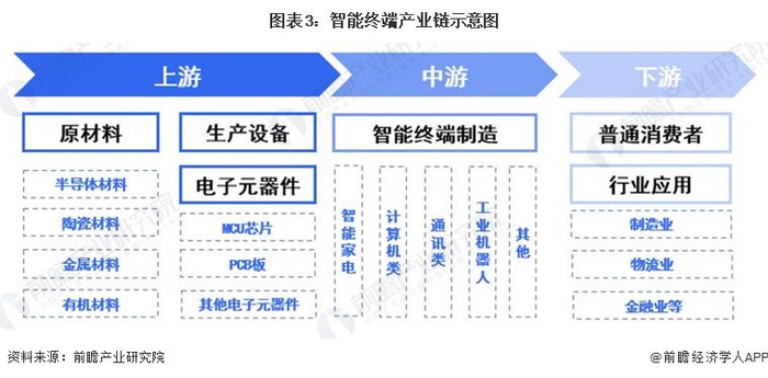 智能终端上游主要是原材料、生产设备和电子元器件生产制造厂商,代表企业有中环材料、龙津绿能紫金矿业等;中游为智能终端制造厂商该环节目前的代表上市企业有:小米集团(01810);创维数字(000810);美的集团(000333);海尔智家(600690);格力电器(000651);长虹美菱(000521);科沃斯(603486);海信家电(000921)等;智能终端行业的下游主要包括C端消费者和B端行业应用等。