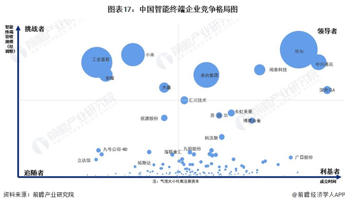 前瞻以企业智能终端产品收入规模为纵轴,成立时间为横轴构建了当前中国智能终端企业竞争格局图。从竞争格局图可知,当前国内智能终端行业处于领导者地位的企业有华为、中兴通讯、闻泰科技、美的集团等;小米、荣耀和大疆等则处于后来挑战者的地位。
