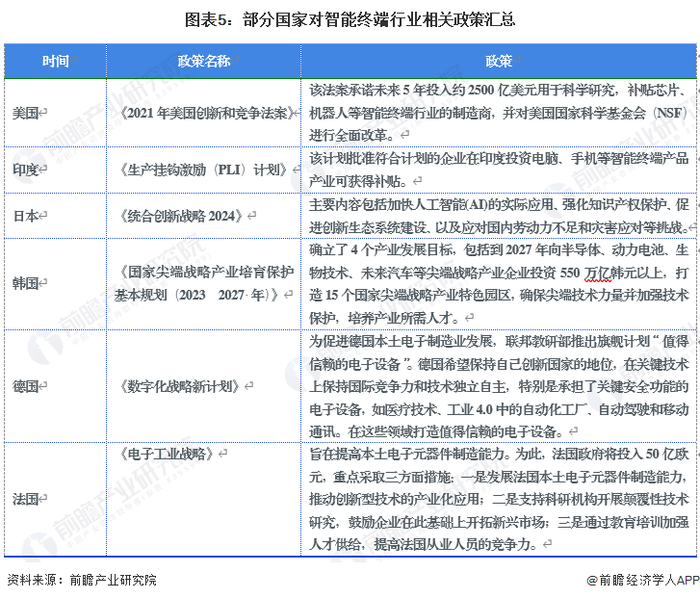 随着全球技术的发展,智能终端已经成为人们甚至各行业日常生产活动过程中的必要工具,因此当前全球主要经济体发布的与智能终端相关重要政策最主要聚焦于提升创新投入,以希望实现在智能终端领域的率先突破升级和自主可控,具体汇总如下: