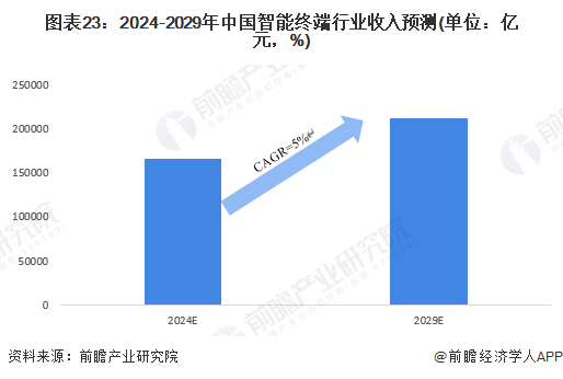 尽管当前智能终端行业受经济需求下行的影响,行业目前处于调整期,但预计未来随着国内政策的扶持以及AI技术的应用和产品创新对智能终端能力边际的不断突破,前瞻预测到2029年,中国智能终端市场规模将超200000亿元。