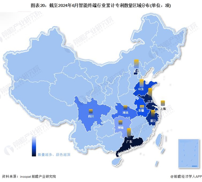 从各省份的专利技术数量来看,当前我国智能终端行业专利数量排名居前5名的城市分别为广东、江苏、北京、深圳和上海,主要以沿海或经济发达地区为主。