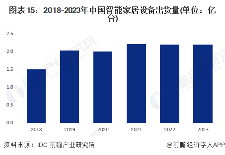 根据IDC的数据,2021-2023年,中国智能家居市场经历了宏观经济下行背景下的消费需求疲软、厂商补贴缩减、技术发展放缓等挑战,使得智能家居出货量整体变化幅度不大。2023年全年,中国智能家居出货量在2.2亿台左右。