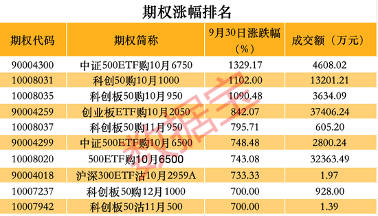 节前期权市场上涨,中证500ETF购10月6750期权涨逾13倍;科创50购10月1000期权、科创板50购10月950期权均涨逾10倍。