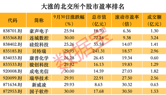 北交所涨幅榜前十个股中,有多达9只个股9月30日成交额超过亿元,包括曙光数创、连城数控、中草香料等,其中连城数控市盈率较低,不到10倍,成电光信不到30倍。牛市会率先消灭低估值股。9月30日涨幅超25%的北交所个股中,豪声电子和连城数控市盈率均低于10倍。
