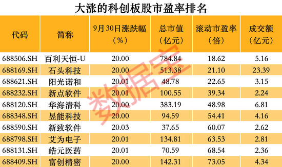 另外,在涨幅20%的科创板股票中,市盈率较低的个股有百利天恒-U、石头科技、阳光诺和,均不足30倍。