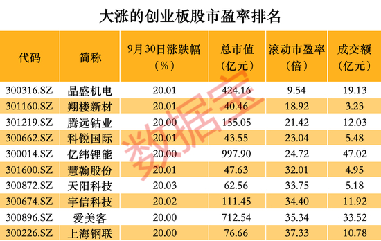 创业板涨跌幅限制也是20%,但开户门槛更低,只要10万元,对大部分投资者而言较为友好。9月30日,有60多只创业板股票涨幅为20%,足见其流动性更优。