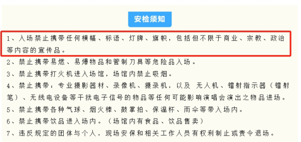 依据民事合同,消费者购买门票意味着与演唱会主办方签订了营业性演出服务合同。观众享受视听盛宴的同时也要遵守义务,不得携带清单禁止的特定物品进入演出场所。现在演唱会均由主办方统一发放应援荧光棒,不让观众自带。横幅、标语、灯牌、旗帜(伸缩旗杆)等物品均在禁带清单之上。为什么?一来可能遮挡他人视线,影响效果体验,扰乱公共秩序;二来容易成为表达自我,宣扬政治、种族、宗教内容的载体。如同现在漫展一律禁止军装cosplay一个道理,任何规定的背后都有原因。为了避免“意外”发生,所以任何旗帜都禁止入场。