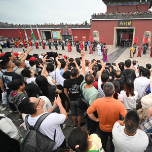 9月16日,游客在河南省开封市开封府门前观看《开衙迎宾》仪式。新华社发(李俊生摄)