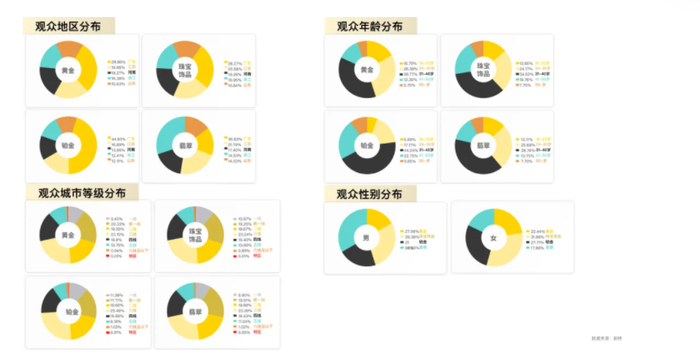 在各类珠宝材质中,黄金呈明显年轻化趋势:18至30岁的人群明显对黄金更感兴趣。黄金相关内容的消费人群中,男性略高于女性,但在翡翠品类中,男性则以61.5%的比例高于女性的38.5%。