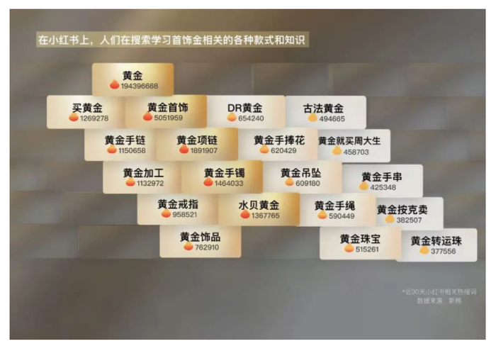 在这一章节,我们研究了目前社交媒体平台(抖音、小红书)上的热门搜索词和话题。随着互联网的普及、“00后”涌入职场,黄金珠宝首饰的零售路径已然改变,