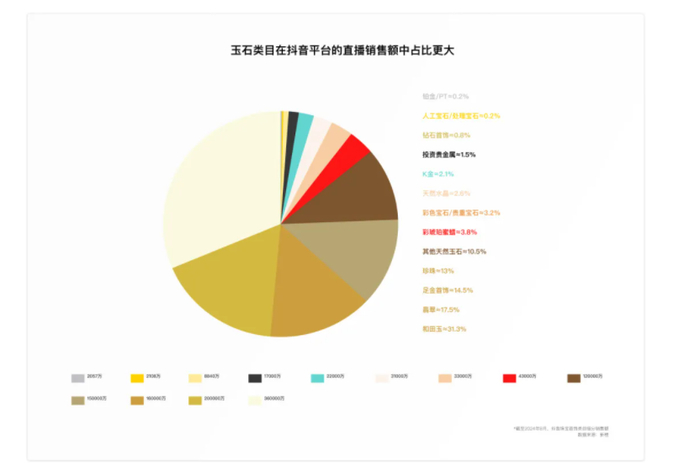 根据抖音平台2024年8月的数据,平台珠宝首饰内容消费的主力人群是31至40岁的用户,分布于广东、江苏、河南、浙江、山东等地。其中,广东的观众占比显著领先于全国其他省份。广东也被认为是中国首饰行业供应链强势的产地省份。