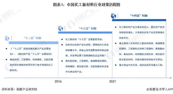 20世纪90年代以来,由于中国在市场经济方面的进一步推进,在广泛引进国际上有关化工技术与产品开发理论基础上,中国的化工材料研究也取得了很大的进步。“十二五”时期,我国IT行业,尤其是消费类电子行业发展迅速,推动电子化学品原材料需求增长;“十三五”时期,我国化工新材料着重于空白品种产业化进程发展,提高行业自给率;经过几十年的发展,中国化工新材料研究开发取得了多项突破性的研究成果,“十四五”时期,在政策推动下,化工新材料行业进入高质量发展阶段。