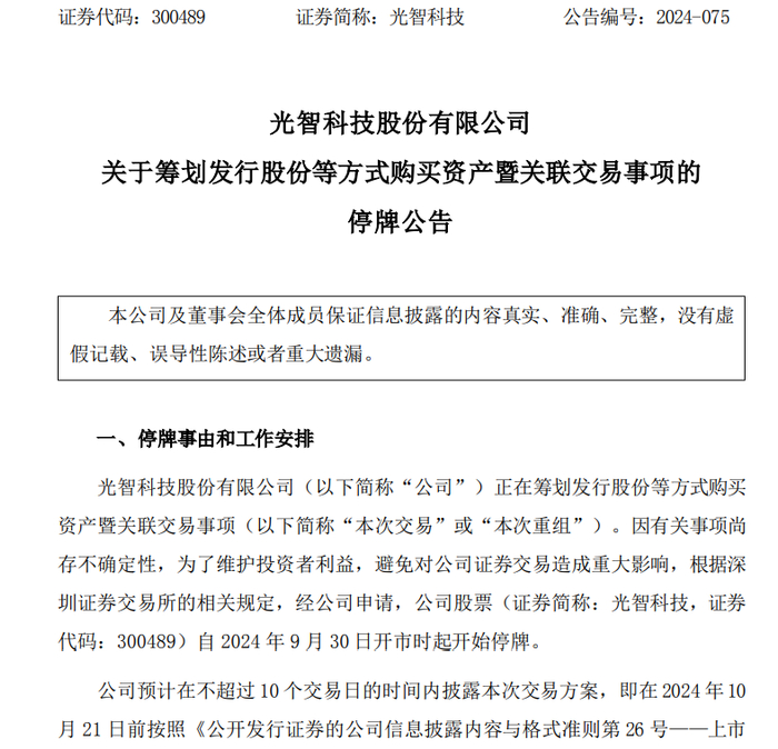 近日,光智科技发布公告称,公司正在筹划发行股份等方式购买资产暨关联交易事项。因有关事项尚存不确定性,为了维护投资者利益,避免对公司证券交易造成重大影响,根据深圳证券交易所的相关规定,经公司申请,公司股票自 2024 年 9 月 30 日开市时起开始停牌。