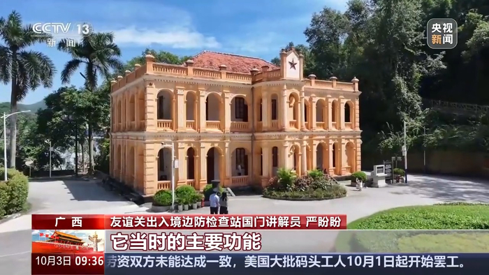 友谊关出入境边防检查站国门讲解员 严盼盼:在友谊关城楼的正后方就是法式楼,法式楼建于1914年,由法国人设计、中国人建造。它当时的主要功能是负责边境的外交以及边境的治安。前面就是越南友谊国际口岸,友谊关不光是景区,红色爱国主义教育基地,它还承担着旅检和货检的通关功能。友谊关将打造成智慧口岸,实现24小时的货物通关。