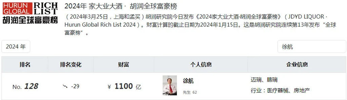 2024年,徐航以1100亿元财富,入选胡润全球富豪榜。