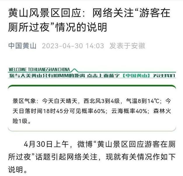 去年4月30日,黄山风景区管委会曾发布“游客厕所过夜”情况说明。图据网络
