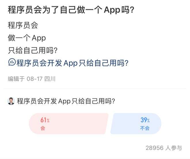 上个月,小辣椒在小红书上刷到一个投票: 程序员们会为自己做一个 App 用吗?