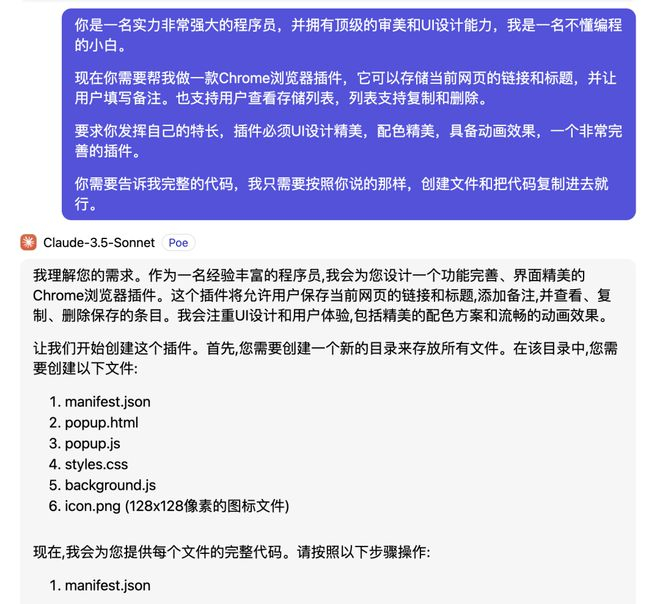 因为 Cursor 里也采用了目前编程能力最强的大模型 Claude-3.5-Sonnet ,所以小辣椒选择直接和 Claude-3.5-Sonnet 对话,让它帮我写一份插件出来。