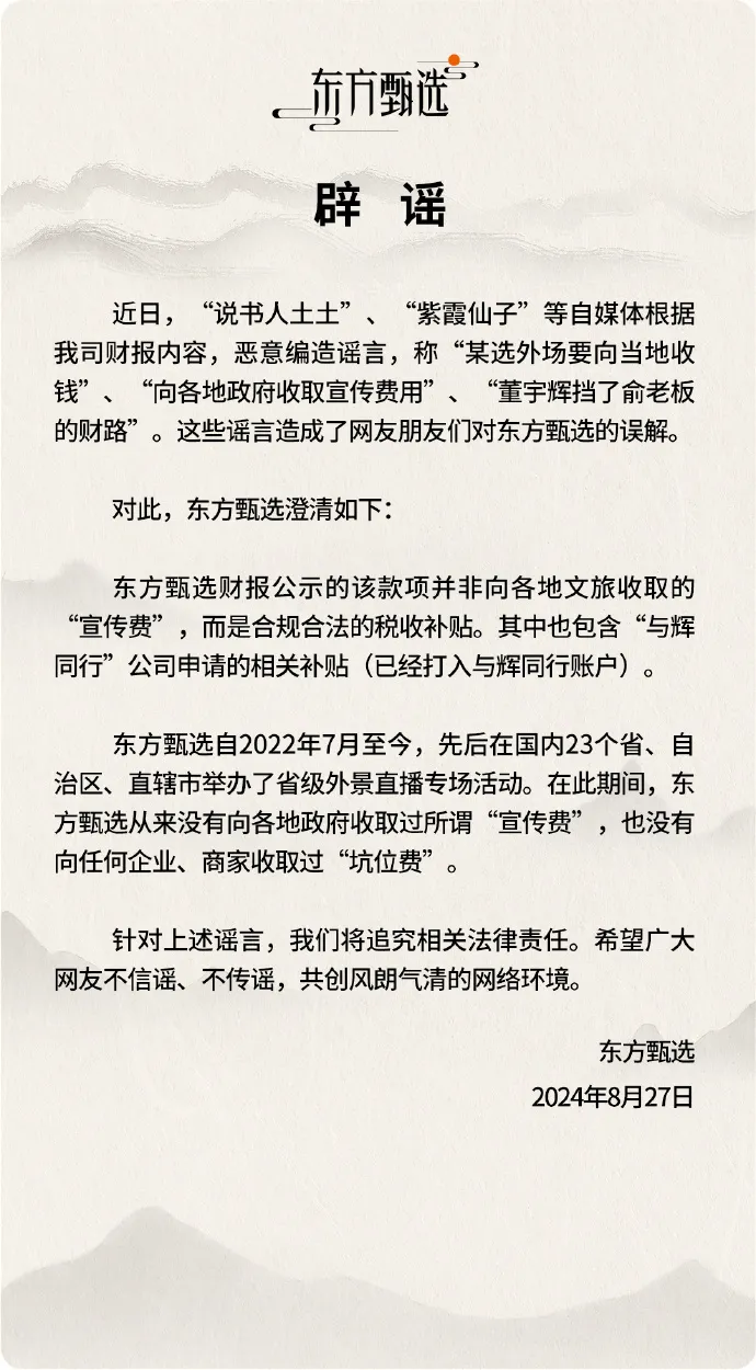 8月27日,东方甄选发布辟谣声明。东方甄选表示,近日,“说书人土土”“紫霞仙子”等自媒体根据我司财报内容,恶意编造谣言,称“某选外场要向当地收钱”“向各地政府收取宣传费用”“董宇辉挡了俞老板的财路”。这些谣言造成了网友朋友们对公司的误解。