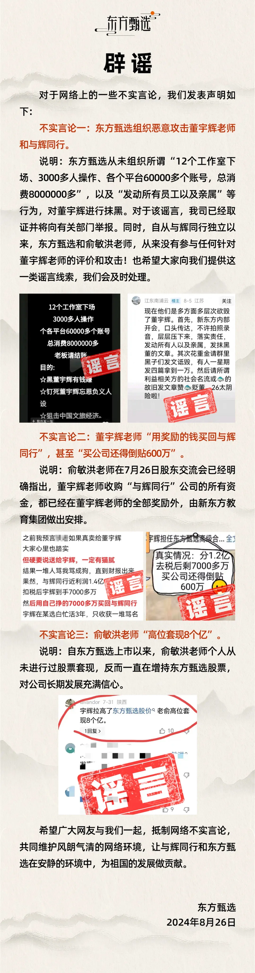 值得一提的是,26日晚间,东方甄选就“东方甄选组织恶意攻击董宇辉老师和与辉同行”“俞敏洪高位套现8个亿”等不实言论发布澄清声明。