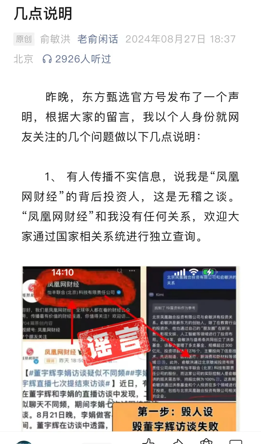 俞敏洪表示,“有人传播不实信息,说我是‘凤凰网财经’的背后投资人,这是无稽之谈。‘凤凰网财经’和我没有任何关系,欢迎大家通过国家相关系统进行独立查询。”