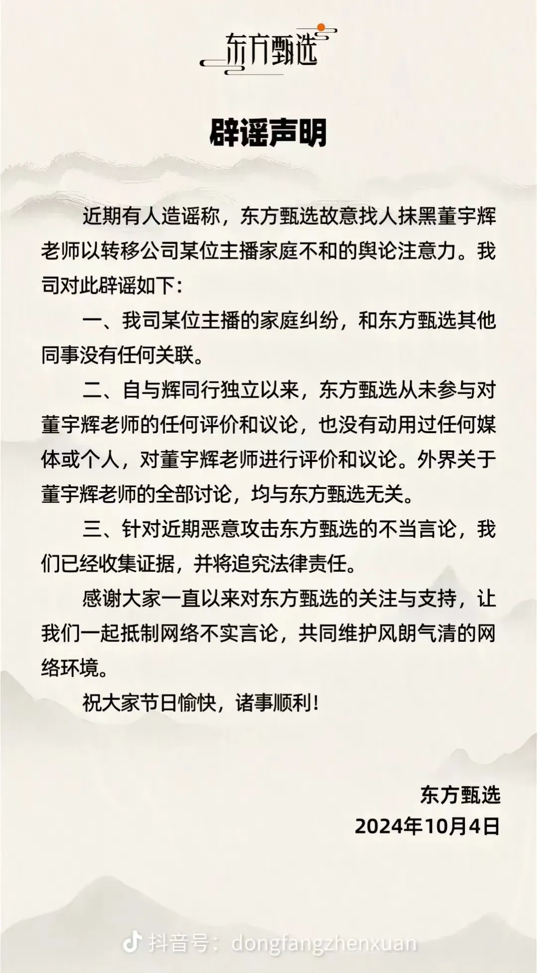 10月4日,东方甄选发布辟谣声明,对“东方甄选故意找人抹黑董宇辉以转移公司某位主播家庭不和的舆论”的说法进行辟谣。