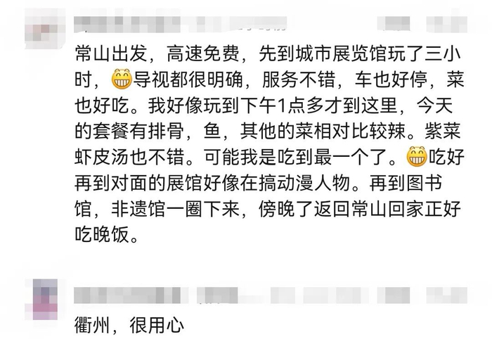 将原本相对封闭的公共资源,转化为可共享的服务平台,用开放姿态与服务意识增强政府部门与民众之间的情感联系,衢州的“开门纳客”之举收获一片叫好声,有网友点赞衢州的用心,还有网友直接在评论区,发了自己的“实地测评”——“服务不错,车也好停,菜也好吃……今天的套餐有排骨,鱼,其他的菜相对比较辣,紫菜虾皮汤也不错……”