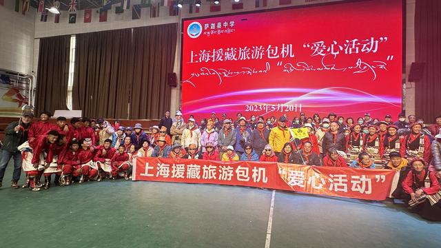 上海援藏旅游包机游客在旅途中赴萨迦县中学开展爱心活动。