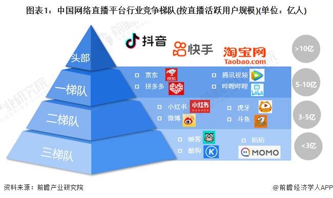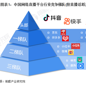 根据直播业务的用户规模,可以将中国的网络直播平台划分为以下四个竞争梯队:头部是抖音、快手和淘宝,这三家企业用户规模都在10亿以上,在国际上也具备强大的竞争力,是不少用户参与到直播活动的最主要平台。